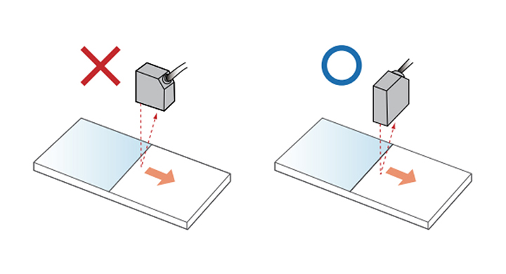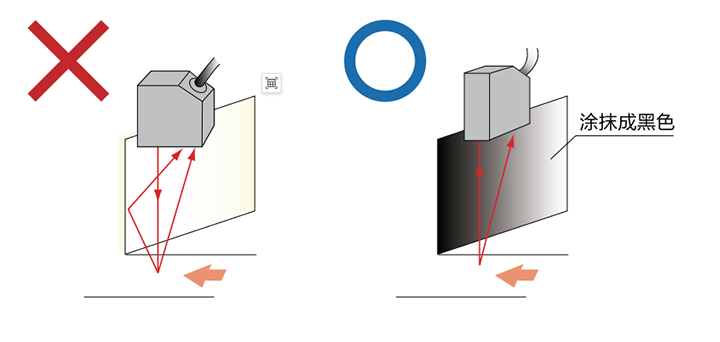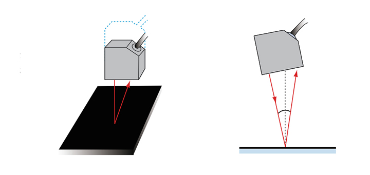 被測物為黑色物體時,反射光量較少,使得受光素子的受光量較少,導(dǎo)致分辨率下降。可以通過縮短檢測距離,讓有效測量范圍內(nèi)盡可能的縮短傳感器的檢測距離,確保受光素子接收到足夠的受光量。也可以【正反射】方式傾斜安裝,時激光的入射角等于反射角,這樣提高受光素子接收的受光量。