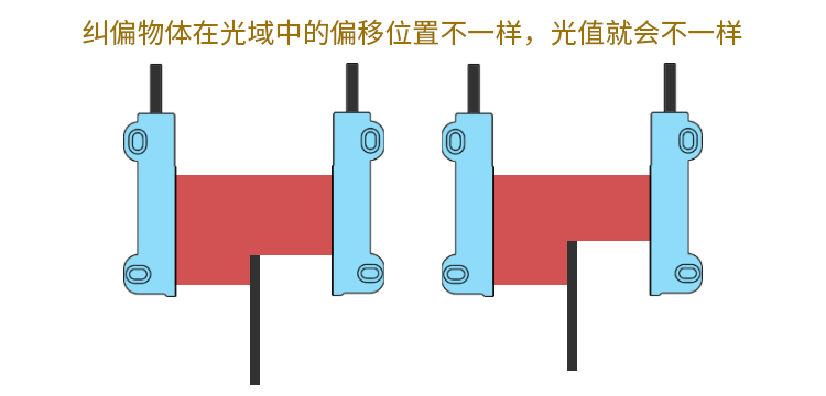 模擬量輸出值和物體位置形成對(duì)應(yīng)關(guān)系就可以進(jìn)行糾偏作業(yè)。當(dāng)模擬量輸出值變小或小于某個(gè)值,說(shuō)明物體往檢測(cè)區(qū)域內(nèi)偏移,需要往外進(jìn)行糾正。如果模擬量輸出值變大或大于某個(gè)值,說(shuō)明物體往檢測(cè)區(qū)域外部偏移,需要往內(nèi)進(jìn)行糾正。