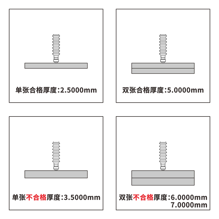 在檢測來料厚度時(shí),合格料的厚度大概為2.5mm,不合格料大概為3.5mm,誤差不超過0.1mm,精度要求不高,而ECOTTER接觸位移傳感器的檢測精度可以達(dá)到0.5um,并且支持動(dòng)態(tài)測量。設(shè)定合格尺寸2.5±0.1mm、5.0±0.1mm,不合格尺寸3.5±0.1、6.0±0.1mm、7.0±0.1mm實(shí)現(xiàn)剔除。