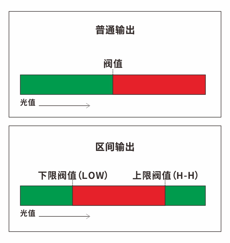 光纖放大器普通的檢測輸出方式是設(shè)置閥值,光值大于或小于閥值輸出信號,檢測有無。而FG-40-H的區(qū)間輸出功能可以選取光值區(qū)間的中間部分輸出,功能更豐富,可以應(yīng)對更復(fù)雜的場景。