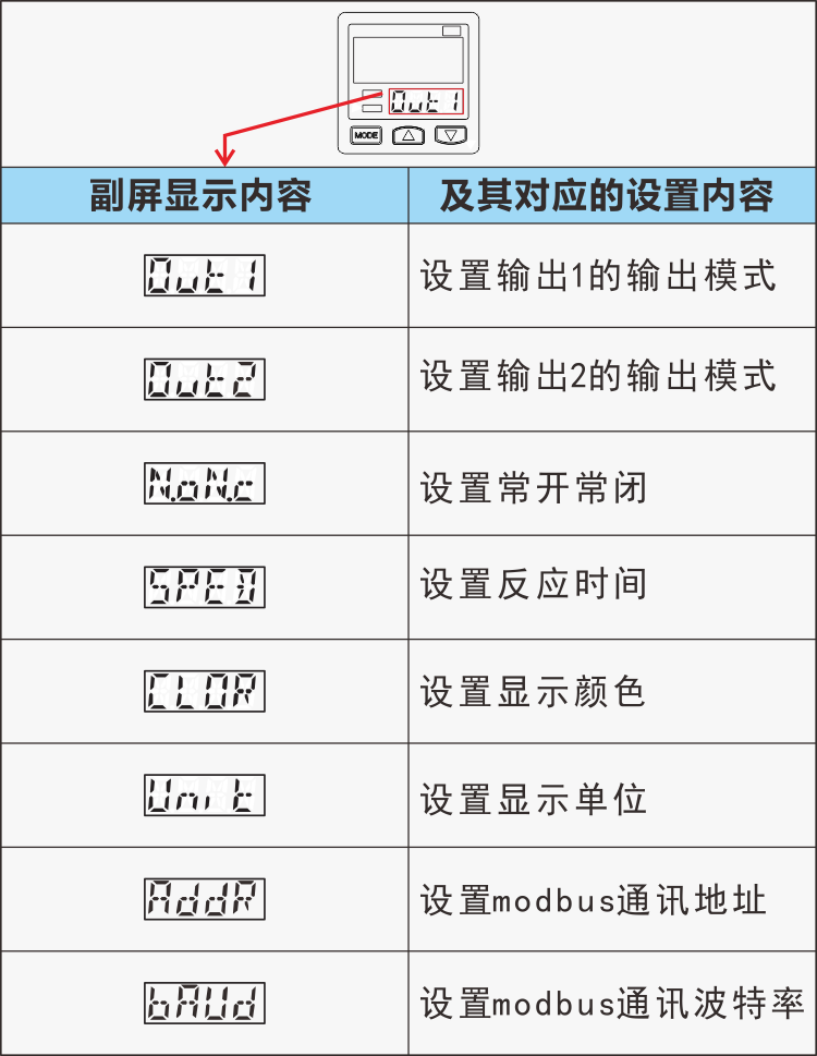 ECOTTER TG-31系列壓力表 可以設(shè)置輸出1、2的輸出模式、常開常閉、反應(yīng)時間、顯示顏色、顯示單位、通訊地址、波特率等,進入菜單后副屏顯示設(shè)置的項目,主屏顯示項目下可設(shè)置的內(nèi)容。