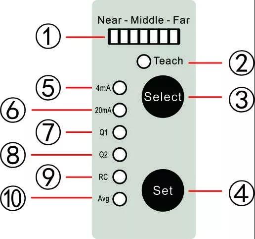 1、按Select鍵5s進(jìn)入功能設(shè)置模式,此時(shí)Teach紅燈亮;
