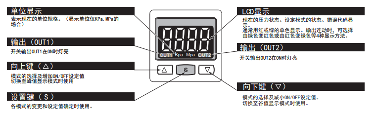 壓力傳感器的外形小巧,正面為L(zhǎng)CD顯示和三個(gè)操作按鍵;背面為電源接入口和氣壓接入口。